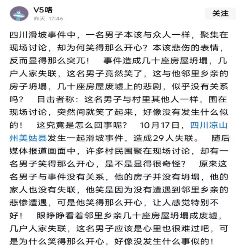 一、2025年2月9日,重庆市垫江县网民周某为“蹭热点”赚取流量收益,使用AI工具生成“四川滑坡事件中有一名男子笑的那么开心”帖文并在网上发布。该信息系在互联网上搜索与不相关图片、文章后编辑而成,捏造四川凉山州美姑县发生山体滑坡事件、当地民众面对灾情不悲反笑等谣言,扰乱公共秩序,造成不良社会影响。属地公安机关已依法对周某处以行政处罚。